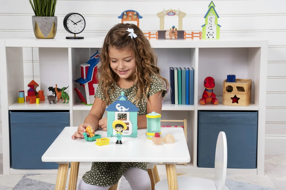 Welcome to the Dino Ranch Hatchery Adventure Set, where new dinos at the Dino Ranch are born! The Dino Ranch Hatchery Adventure Set is the perfect way to build out your own Dino Ranch. Join one of the three Dino Ranchers, Min, in this fantastic adventure! The young Dino Doctor-in-training loves to help hatch the baby dinos. You can help her by placing the Dino-Mite into the incubator and pressing the gear wheel to activate! The incubator lights up, revealing the baby dino’s silhouette! Included are two baby dinos with articulated heads. The playset also comes with ranch accessories including a dino wading pool and a cart that flips to a nest! You can also build your own hatchery by putting the two fence pieces together. The Hatchery fence pieces can also connect with other fun Dino Ranch toys, like the Dino Ranch 2-Figure Pack or the Action Pack assortments (sold separately).