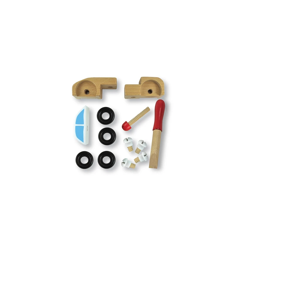 A 13 piece construction set made from beech wood. The set is joined together with screws that can be tightened with the screwdriver provided.