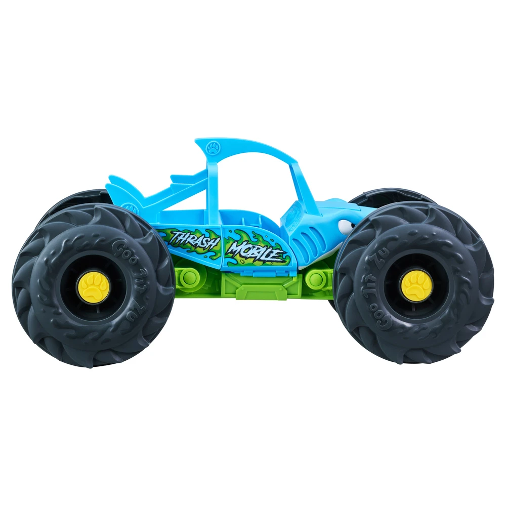 Get ready to roll into the action with Thrash and his awesome “Stretch And Strike” Thrash Mobile! This shark shaped vehicle has two amazing modes! Push down to stretch the wheels out and move along in “Speed Mode” or pull up the chassis and launch an attack in “Strike Mode” and launch missiles from the shark jaws! Includes Exclusive Race Suit Thrash figure. Thrash can stretch up to 3 times his usual size! Then watch as he goes back to his original shape and size. The Goo Jit Zu “Stretch and Strike” Thrash Mobile comes with 3 Missiles that sit in the doors and the launcher.