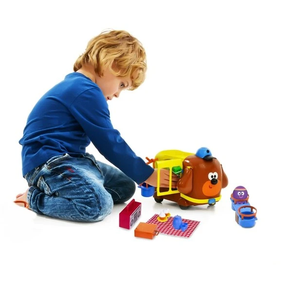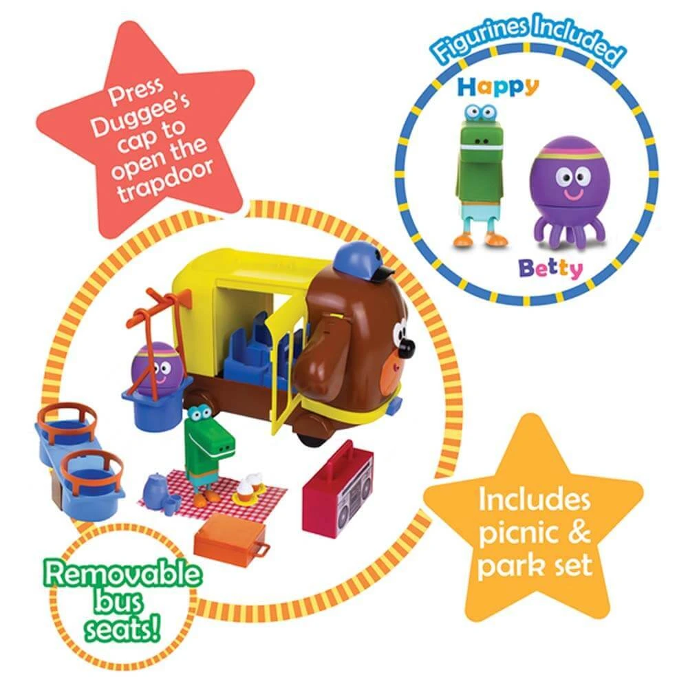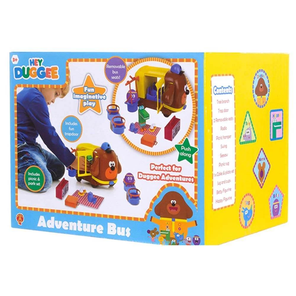 The Hey Duggee Adventure Bus is perfect for fun role-play. Packed with fun and action: ideal for curious kids! Push the bus and Duggee’s ears hilariously flap up and down! Push down on Duggee’s hat.