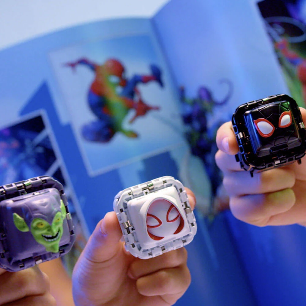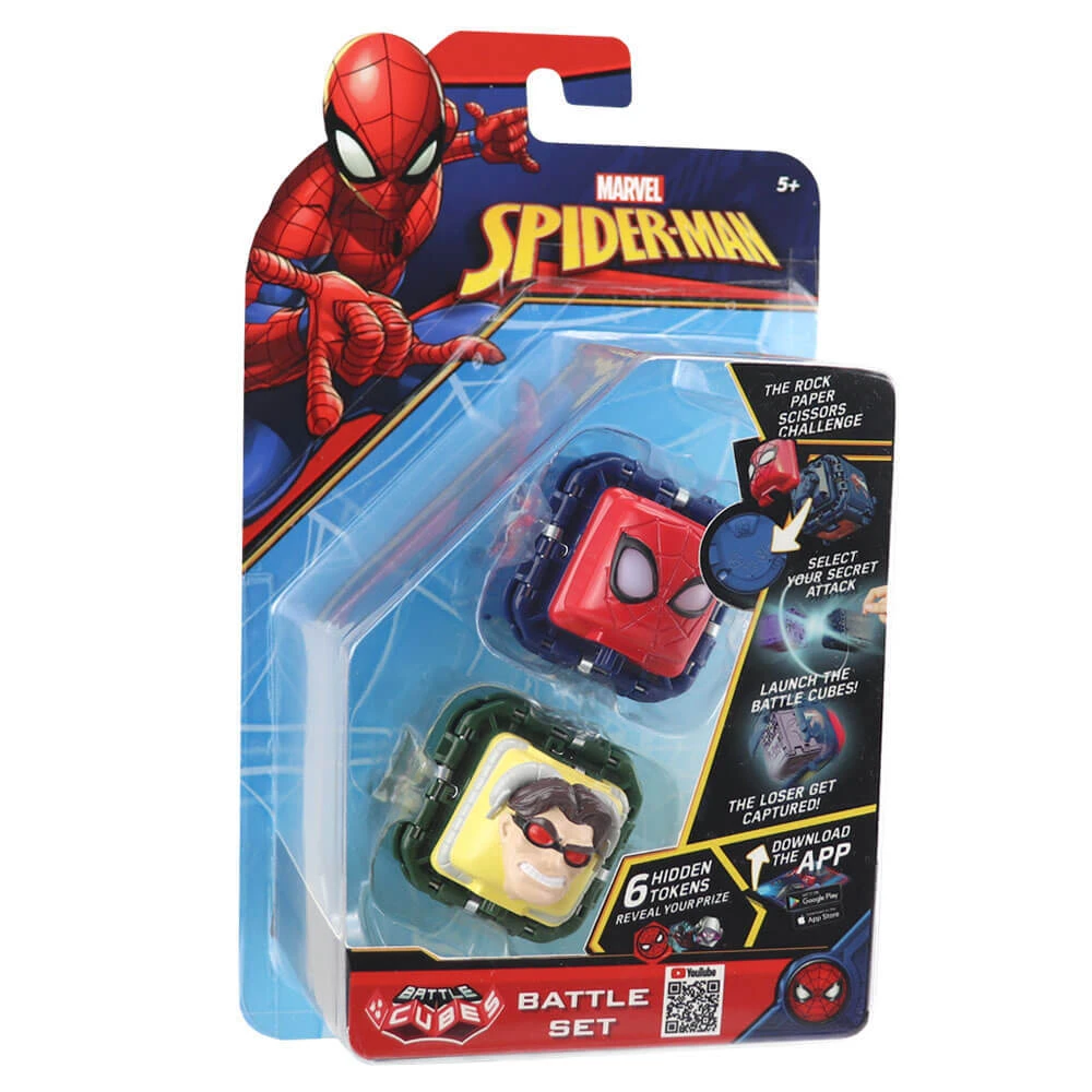Battle Cubes is a collectible pocket-sized battle game where you challenge opponents on a rock-paper-scissors fight like never seen before! Battle Cubes are available in two super cool versions: Marvel Avengers and Spider-Man. Step 1: Select your secret attack, 2: Set your cube in battle mode, 3: Slide your cube against your opponents! Winner gets the token and the loser gets captured! Tokens are included with each pack- trade them or win by playing. Every token is a puzzle piece. There are 12 rare tokens to collect and 48 tokens to collect and play. The Spider-Man display unit includes 4 assortment packs of Spider-Man vs Venom, Spider-Gwen vs Green Goblin, Miles Morales vs Rhino and Glow Spider-Man vs Octopus. Each pack contains 6 tokens.