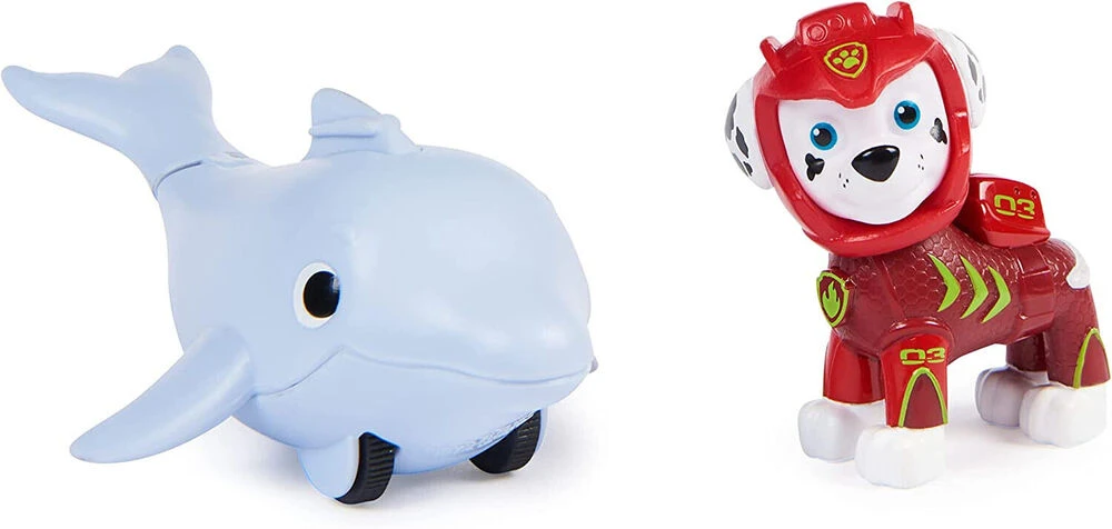 Team up with Marshall and his trusty Dolphin pal as they go on exciting missions in the pretend seas! Wearing his red Aqua Pups wetsuit, with true-to-show fish-scale details and a super cool divers helmet, Marshall is ready for exciting missions on the high seas and looks just like he does in the PAW Patrol: Aqua Pups Series! Marshall and his trusty Dolphin pal are ready for some high-speed rescue action! When there’s trouble afoot, place Marshall onto the fin on Dolphin’s back then roll them forward to activate his tail-fluke action and save the day! Each pup comes with a different animal pal, so collect all the PAWsome pups and their aquatic friends (each sold separately) then use your imagination to create your own missions or relive your favorite scenes from the hit series over and over again!